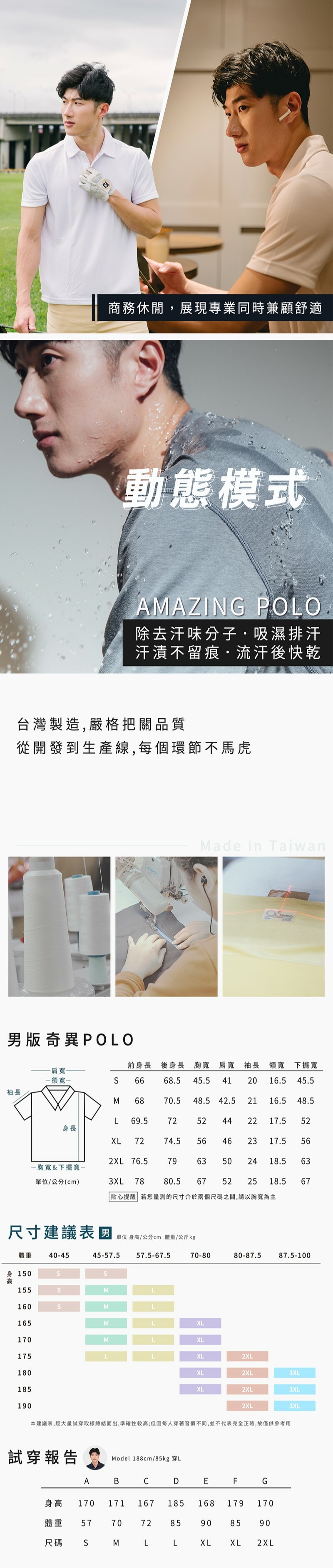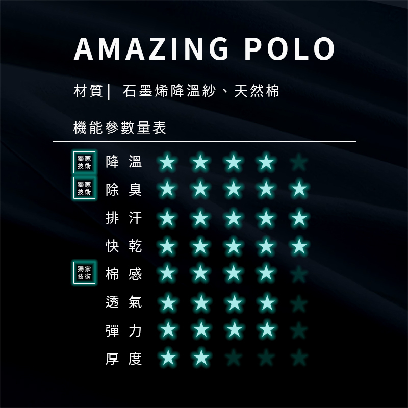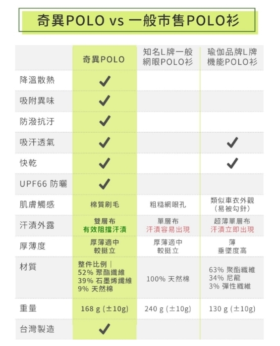 依台灣夏季氣候為基礎設計,通過多項國際標準檢測,第一件 『吸臭.降溫.快乾』 又兼具散熱、透氣、棉感跟防曬的奇異POLO。