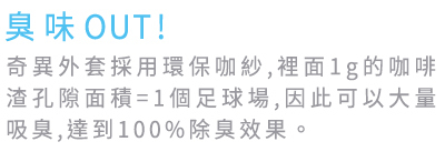 超棉感的機能外套,採用環保咖啡渣機能紗,運用獨特製程做出超柔棉感永久天然除臭,洗完3小時快乾功能
